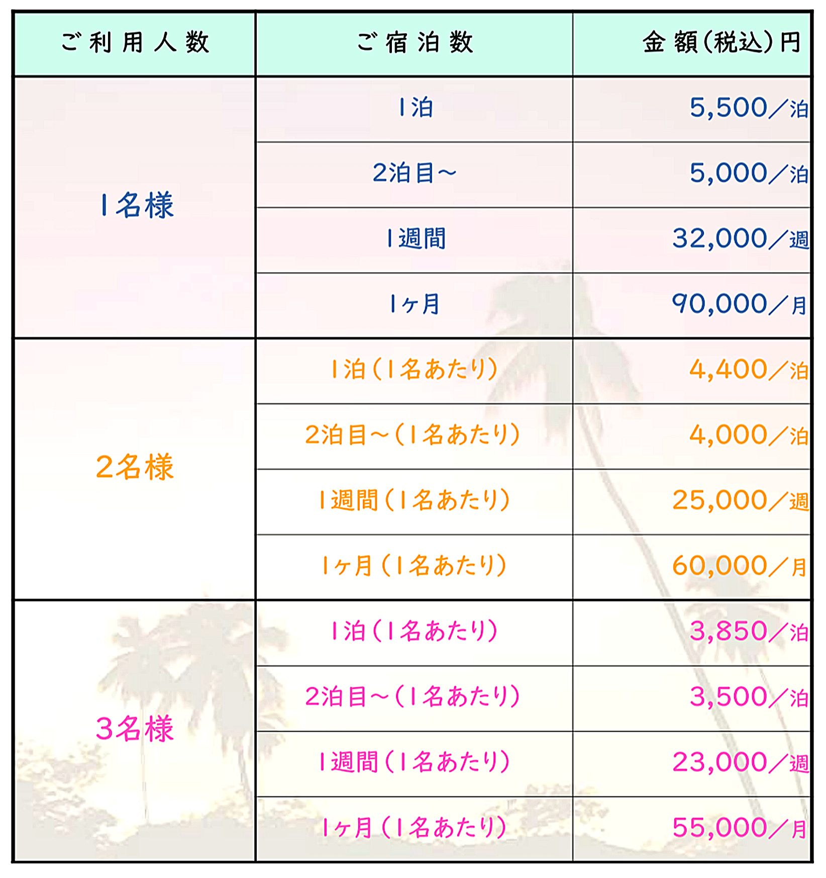 ■ご宿泊について■ マリンドリーム夢塾では、『ペンションレーヴ万座』(全室洋室)をご案内しております。 恩納村の長閑さにのんびりしながら、徒歩圏内には便利なお店や飲食店、コンビニや郵便局も! 尚、料金表の下へ禁煙ルール等のお知らせ事項を記載しております。 お手数ですが、ご予約・お問い合わせの前にご一読くださいますよう、お願い申し上げます。 |